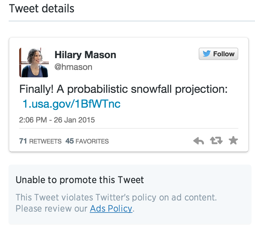 Randomly discovered that my enthusiastic weather-predictions-with-error-bars tweet violates Twitter's ad policy. Hmm?pic.twitter.com/8Bc7l3zwJF