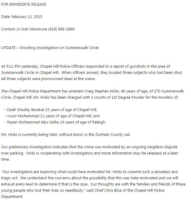 Dispute over parking? MT @zeynep: Chapel Hill Police Dept. Neighbor dispute suspected, hate crime investigated,pic.twitter.com/R2aWbOtOU7
