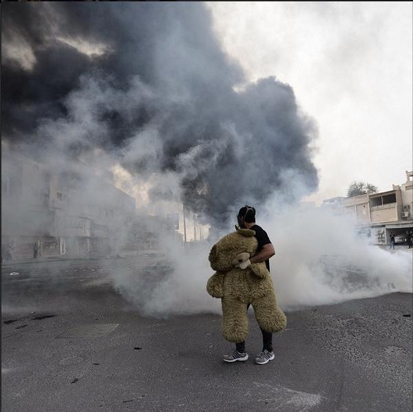 Forgotten uprising. Bahrainis deploy teddy bears to stop the riot police. Bear got gassed. http://globalvoicesonline.org/2015/02/14/teddy-bears-face-off-with-police-as-bahrain-marks-its-fourth-anniversary-of-anti-regime-protests/ …pic.twitter.com/XusHRCeNH8
