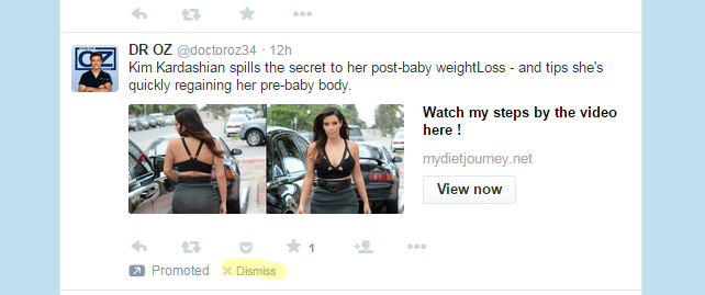 Twitter's ads have "dismiss" button! Now need script that replaces "post-baby body" or "Dr. Oz" with "snake people".pic.twitter.com/JBbXfSgY7K