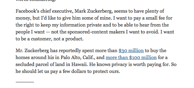 Zuck paid hundred million dollars, y'all, to preserve his privacy. He gets the value. http://www.nytimes.com/2015/06/04/opinion/zeynep-tufekci-mark-zuckerberg-let-me-pay-for-facebook.html …https://twitter.com/maassp/status/606452059764891648 …