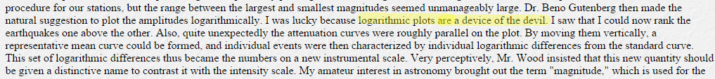 TIL: Charles Richter (of the scale) thought logarithmic plots were "a device of the devil." http://archive.is/OMV5t#selection-383.1396-383.1472 …pic.twitter.com/yuWD7Ct6yt