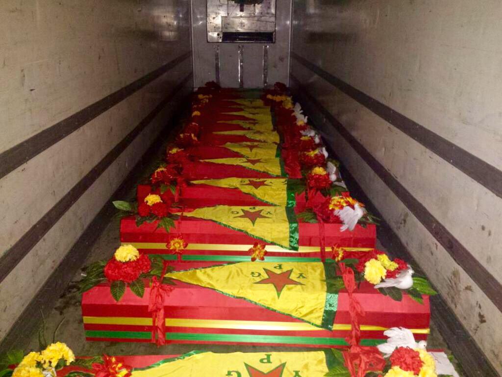 Bodies of 13 #YPG fighters kept in a truck & still not allowed to enter Turkey. Devastated families waiting at border pic.twitter.com/b2CU6gdNsA