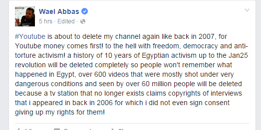 Outrageous. YouTube has a more severe form of political censorship via copyright than Egypt's military governments.pic.twitter.com/YhrgwclWdJ