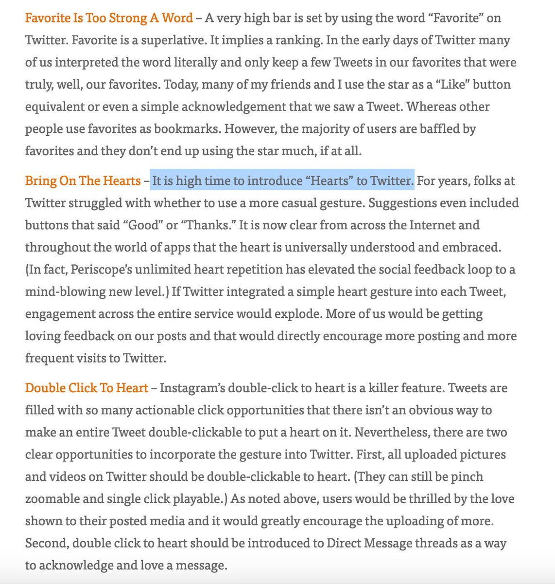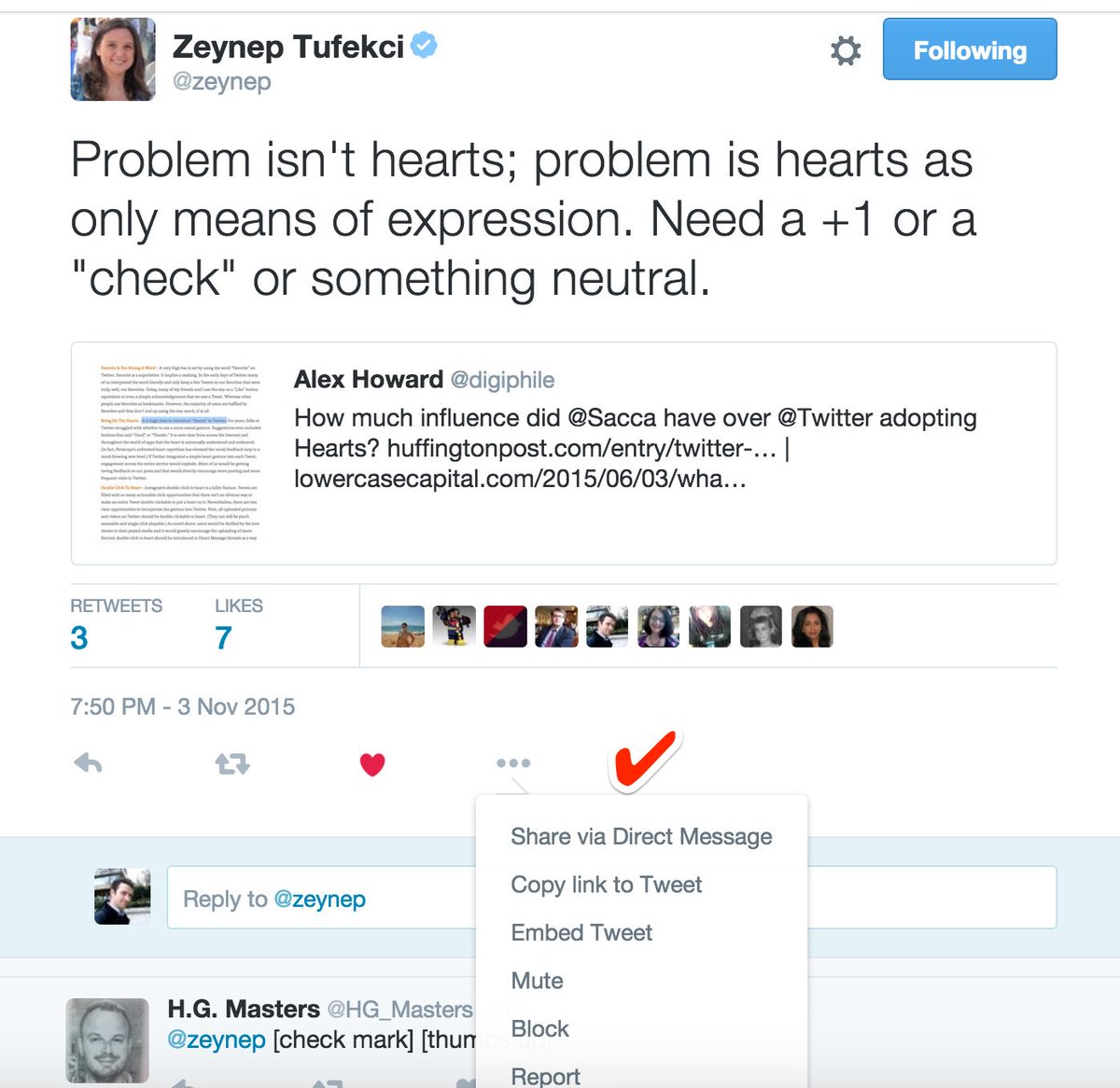 @zeynep@digiphile@sacca@twitter WRT zeynep article about "FB Tyranny of like" unlike FB, 'heart' doesn't appear to ones followersThanks. Twitter will use this to make your timeline better. UndoUndo