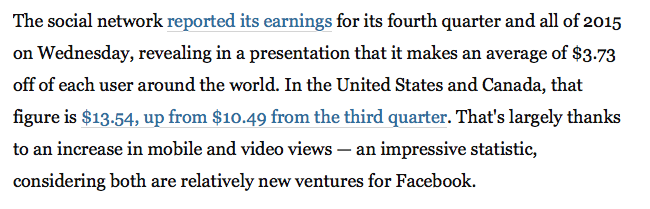 Congratulations! You're worth at least $3.73 to Facebook. https://www.washingtonpost.com/news/the-switch/wp/2016/01/27/this-is-how-much-money-youre-worth-to-facebook/ … pic.twitter.com/GMdhaAlEZ2