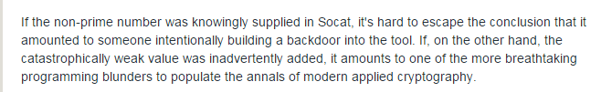 Hey, Crypto by groundhog! In "OpenSSL address implementation, the hard coded 1024 bit DH p parameter was not prime". http://arstechnica.com/security/2016/02/crypto-flaw-was-so-glaring-it-may-be-intentional-eavesdropping-backdoor/ …