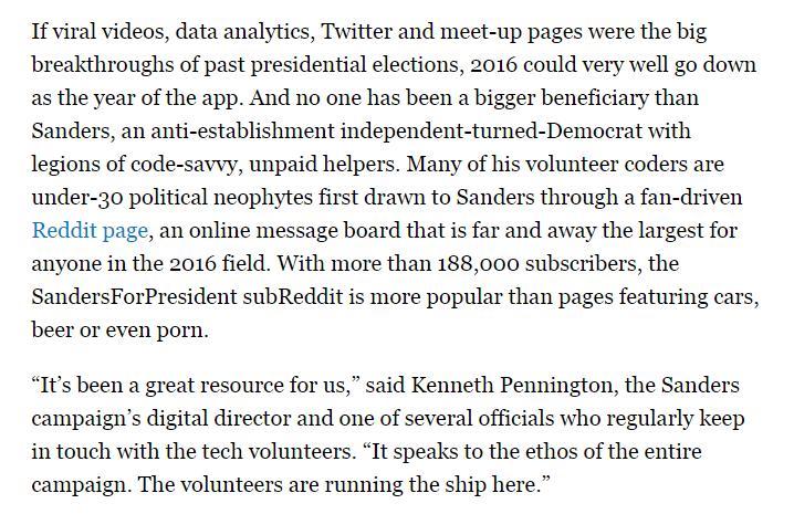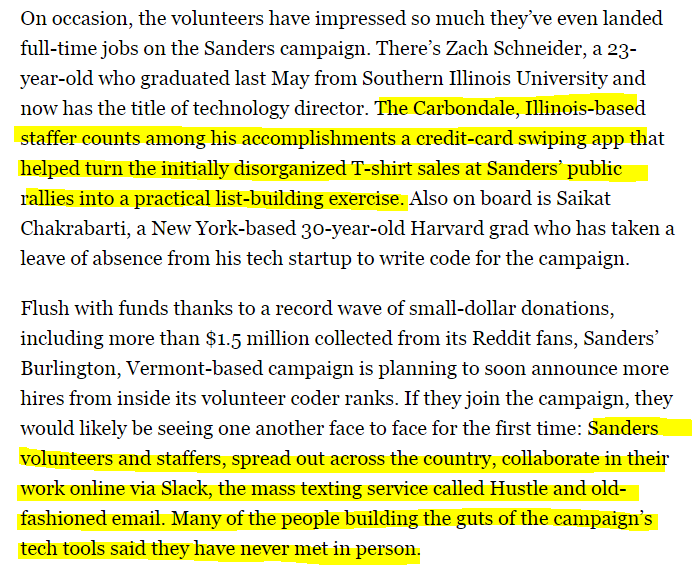 More from the Politico piece on Sanders' digital team. Volunteers, dispersed, coordinating over slack/email/text.pic.twitter.com/sGgBx1AMGN