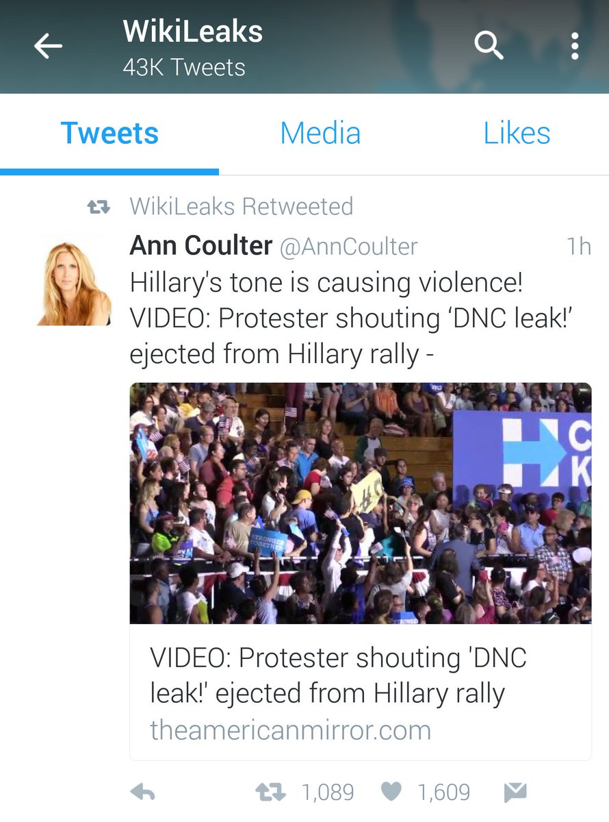 Notice WikiLeaks' tweet linking to Breitbart (of all places), just after they defended Milo Yiannopoulos.