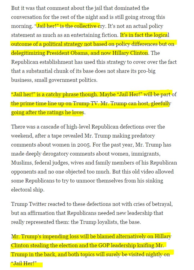 My NYT piece on how the debate launched GOP civil war and Trump TV—led by "Jail Her!", its future prime time show. http://www.nytimes.com/interactive/projects/cp/opinion/clinton-trump-second-debate-election-2016/trump-twitter-loved-it …pic.twitter.com/pNBNWKqfKf
