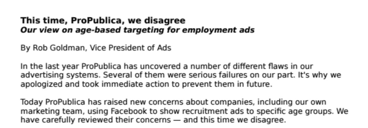 I think that’s why the lawsuit is against advertisers who used FB to age discriminate and so it stands to reason FB becomes economically incentivized to re-engineer certain targeting and ad review to make advertisers feel more shielded from litigation risks.