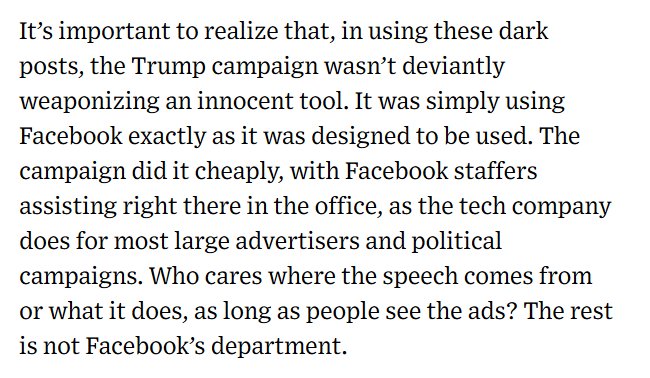Another major but terribly mundane piece of the puzzle that's mostly absent from much of the discussion about free speech etc. is that the big attention-brokers, especially the Facebook/Google duopoly, are ad-brokers. ¯\_(ツ)_/¯ Most everything else flows from that.