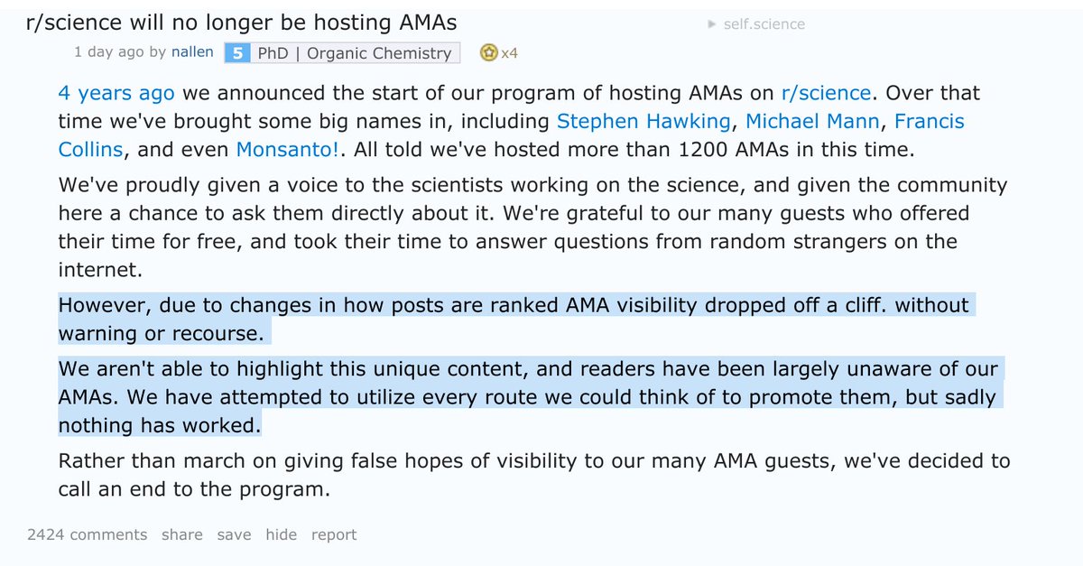 Today in algorithmic overlords: Due to a change in algorithm in how reddit posts are ranked, r/science AMA visibility "dropped off a cliff, without warning or recourse". "Nothing has worked." So no more AMAs. This is where Stephen Hawking had done an AMA, among many others. 😢pic.twitter.com/SWgEHFMMos