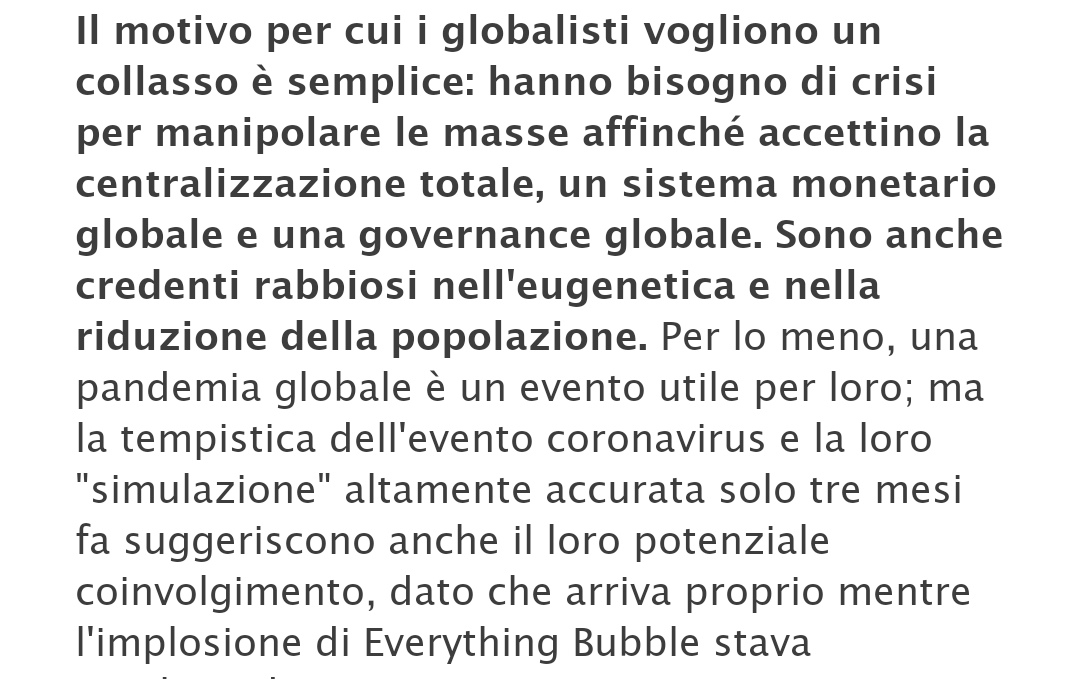 "Il motivo per cui i globalisti vogliono un collasso è semplice: hanno bisogno di crisi per manipolare le masse affinché accettino la centralizzazione totale, un sistema monetario globale e una governance globale. Sono