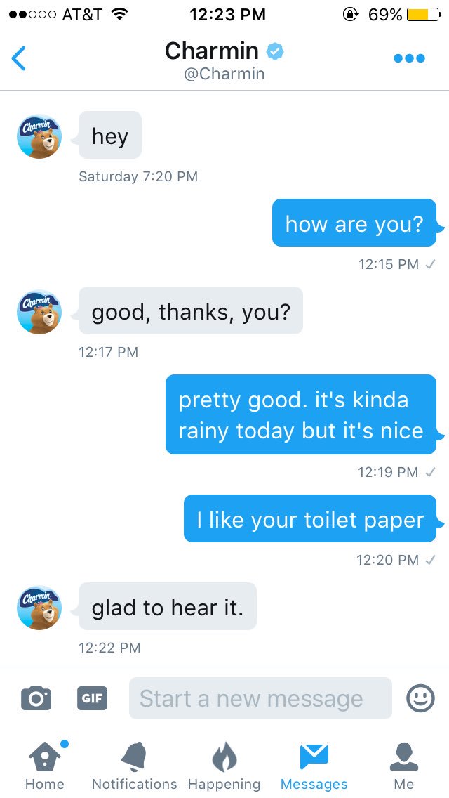 just a good, friendly, light-hearted conversation that for some reason charmin initiated with mepic.twitter.com/GUK7jM5VzY