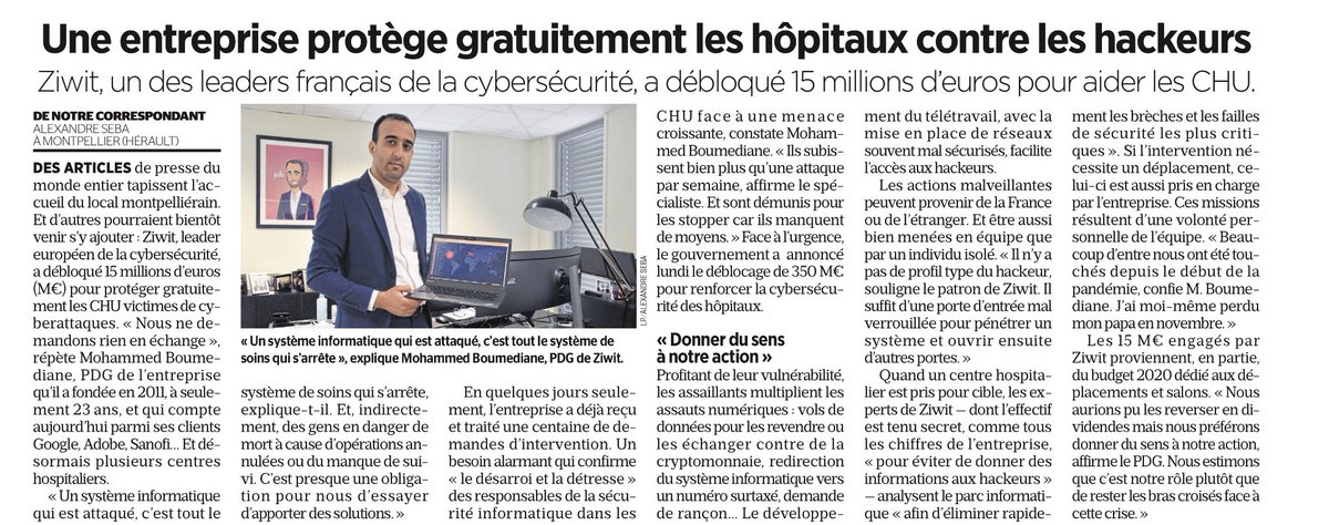 Un immense merci à @BOUMEDIANE & l’entreprise montpelliéraine@ziwit qui va renforcer gratuitement la#cybersécurité des CHU de France, en débloquant 15 millions d’€ !pic.twitter.com/1A8S7iPlH9