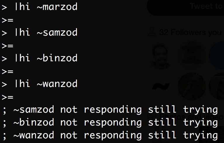 A good and very helpful exercise would be booting a ship and trying to |hi a few of our galaxies. We're running: ~samzod, ~marzod, ~binzod, ~wanzod and ~dopzod.