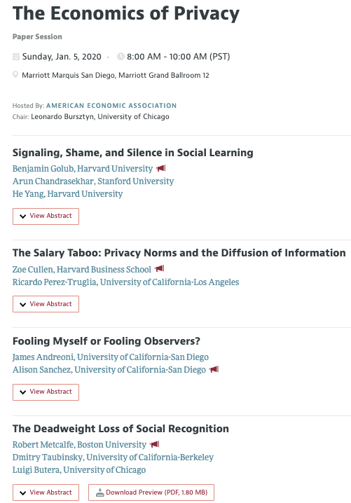 @DTaubinsky) paper in the Economics of Privacy session on Jan 5 at 9am at#ASSA2020 with@ben_golub@zoebcullen Feel free to stop by#econtwitter Paper link: https://www.nber.org/papers/w25637 pic.twitter.com/3D85gVi2BQ