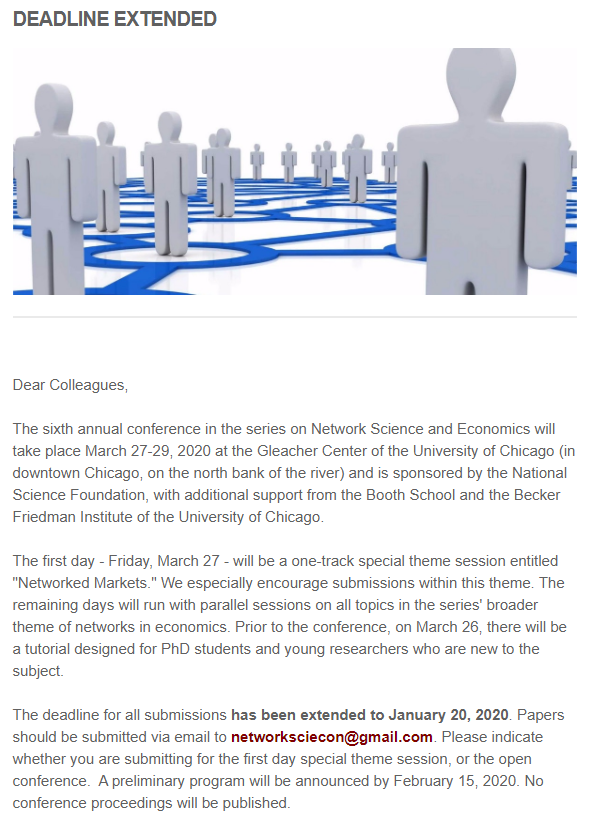 PLEASE RT. 6th Network Science and Economics conf. will be hosted by U. Chicago: Mar 26: special tutorial - aimed at students, all welcome Mar 27: special one-track session on Networked Markets. Mar 28-29: main conference Deadline extended Jan 20. https://bfi.uchicago.edu/event/sixth-annual-conference-on-network-science-and-economics/ …pic.twitter.com/xJImcoh9dw
