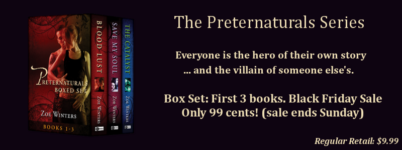 Preternaturals Series Box set sale 99 cents! Through Sunday only! http://www.amazon.com/Preternaturals-Boxed-Set-Books-1-3-ebook/dp/B018FLYEF2/ref=sr_1_2?ie=UTF8&qid=1448576216&sr=8-2&keywords=zoe+winters …pic.twitter.com/XQti89FUVB