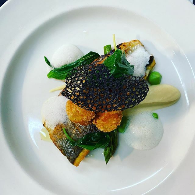 Seabass | Prawn Tempura | Celeriac | Wild Garlic | Squid Ink Tuille | Smoked White Truffle Foam