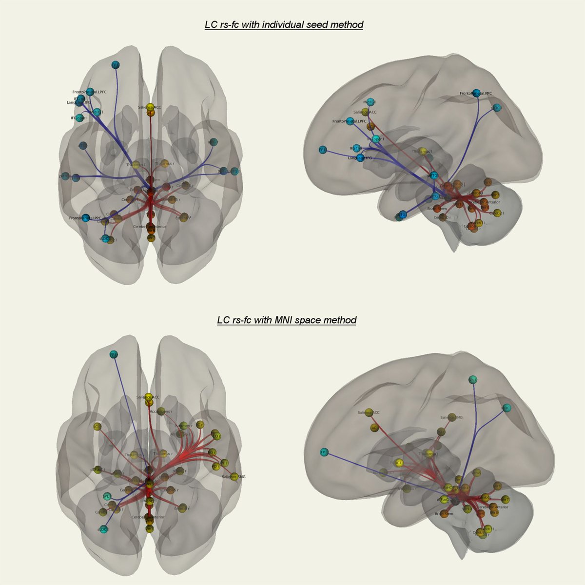 Locus coeruleus connectivity at 3T based on individual localization using a neuromelanin sensitive sequence as compared to MNI space masks. Results largely converge, though the TPJ may be driven by other nuclei. Good news for atlas-based analyses! https://buff.ly/3b7auYk pic.twitter.com/WswNzQSHA5